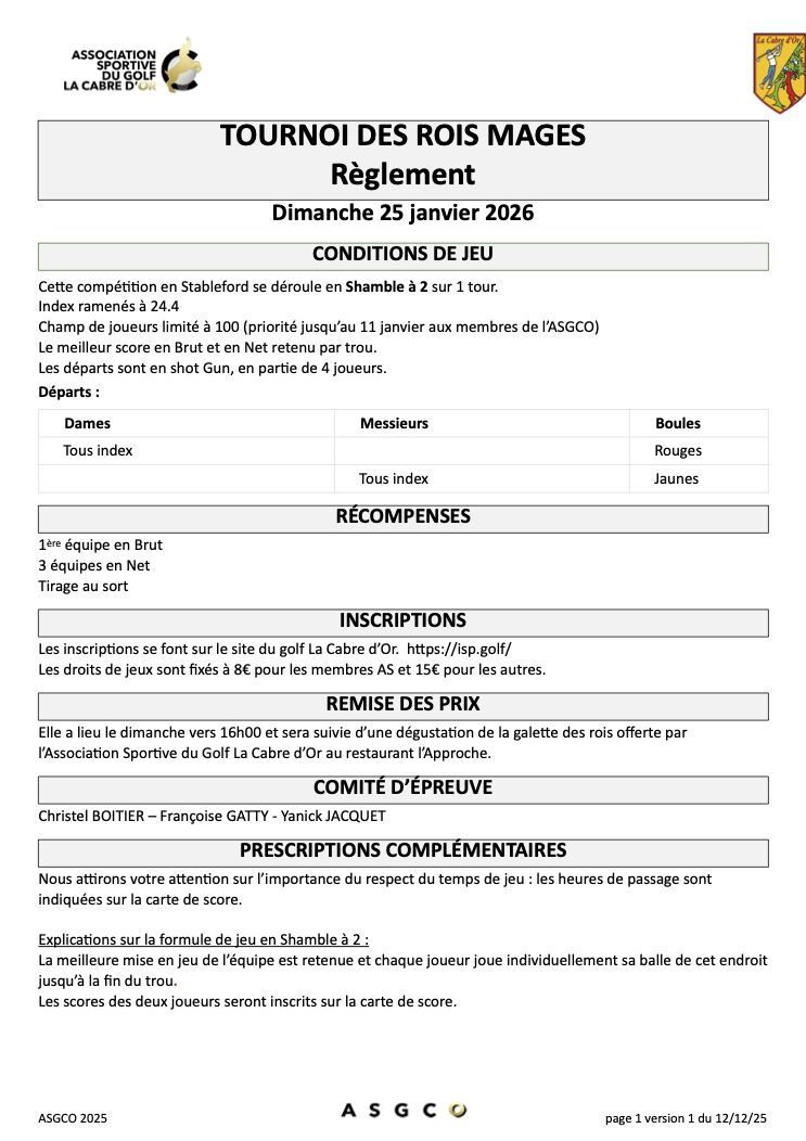 TOURNOI DES ROIS MAGES Première compétition de l’année organisée par l’ Association Sportive / INSCRIPTION ASGCO Vie du Club